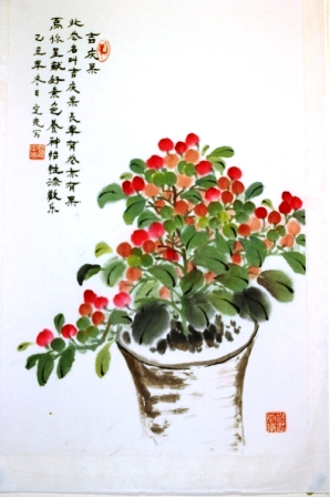 此花名叫吉庆果, 长年有花亦有果; 为你呈献好景色, 养神怡性添欢乐。 注: 吉庆果又名“玉珊瑚”是茄科代表性家庭盆景花卉。 花如星星,清丽可人,果 如“迷尔玻子”,初时清淡, 后渐转橙黄和红色,经久不落,“四季吉庆”