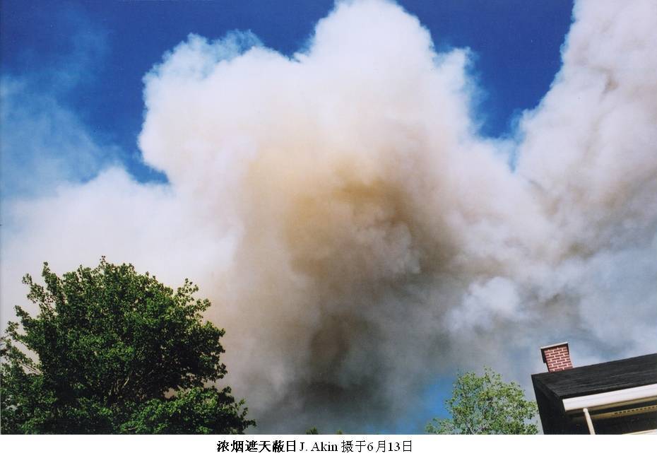 Tantallon到了。我机械地下了汽车,忘记了是怎样走进Sobye‘s商店的,也全然不知在那儿转了多少个来回――焦急地等鲍博的电话。终于忍不住拨通了鲍博的手机。没有答复。我冲出了Sobye‘s商店想换个地方喘口气。然而外边的氛围更艰于呼吸--一辆辆救火车尖叫着、风驰电掣般扑向Glen Haven大火,那里的浓烟已遮天蔽日。这时,鲍博来了电话:“我还在林子里设法切断火路,等我电话”。电话又挂断了。