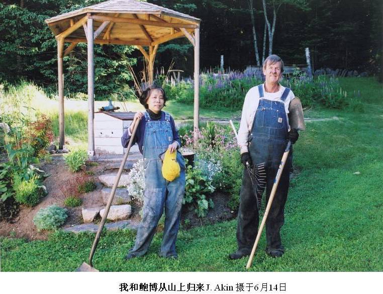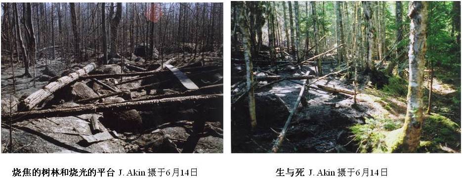 对鲍博我几乎没说什么安慰的话。只是曾在山上和他一起干得极像个男人。大火使他失去了10%的树林,包括去年他将一块块木板、一根根木杆抗上山顶而搭建的一个平台。尽管还没完工(幸亏没完工),冬天我们曾经在平台上享受太阳的温暖,夏天坐在那儿赏月、乘凉。现在大火已经把所有的木板烧光,只留一副炭骨架和烧不化的钉子。平台周围一片刚刚长起来的小云杉枝头的新芽曾青翠欲滴,此刻焦焦的、卷曲着不堪入目。这是鲍博用心呵护了几十年的山林――怎样的一个具有生物多样性的体系:从苔藓、地衣、蘑菇、花草、灌木到百年参天大树;从低等动物如原虫、昆虫到鸟类、爬行类以至哺乳动物野兔、松鼠、鼹鼠、豪猪(porcupine)、浣熊、狐狸、狼和野鹿。鲍博曾领我走遍林子的每一个角落,并如数家珍般教会我它们的英文名字。大火瞬间将它们舔食了(尽管是10%),而且舔得那样轻而易举!此刻,任何安慰都显得苍白。