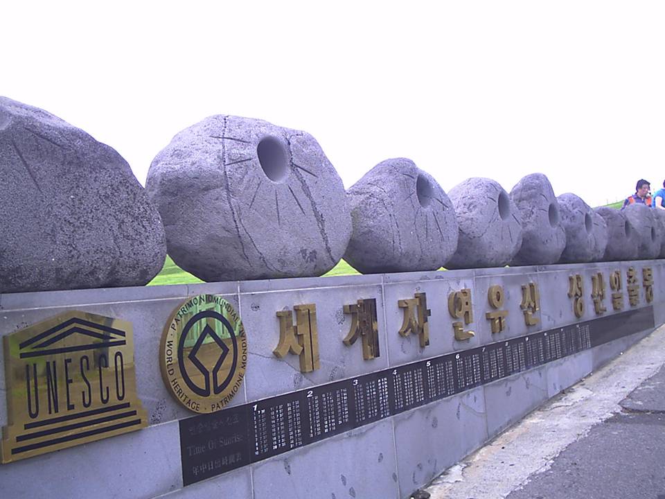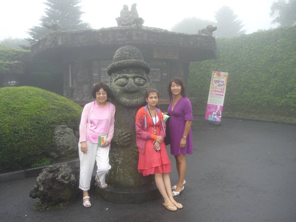 岛中央的汉拿山是韩国第一高峰,海拔1950米,大约20--30万年前火山爆发,现在是一座死火山。(在北京我看见“汉拿山韩国烤肉”的招牌。所以济州岛是一座火山岛。他留给人们的是火山爆发后冷却的熔岩---一块快大大小小的冰冷的黑色石头----玄武岩。人们就把希望寄托于这冰冷的岩石,热呼呼的财源也就从中而生。他们用这石头雕刻成两个半身人像,右手在上面的是文官,祈求孩子学习好,左手在上面的是武官,祈求身体健康。这是人就成了济州的特征,旅游景点的入口处,文官和武官站在两旁,济州人用它们祈福,我们也跟他照个像。对旅游者即是艺术品又是纪念品,我自然要买回一个做纪念。