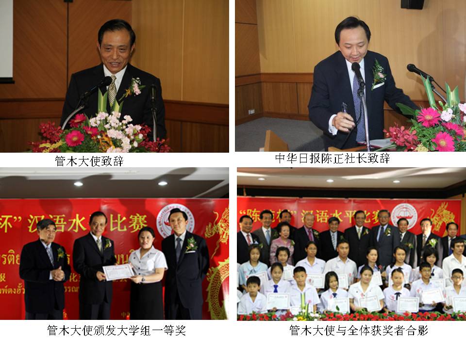 下午三点钟举行颁奖仪式。中国驻泰王国管木大使在颁奖仪式上致辞时说,在中泰两国政府的大力支持下,泰国汉语教育不断发展壮大,汉语教学已成为中泰关系的一大亮点。目前中泰合建的12所孔子学院、11所孔子课堂和1千多名汉语教师志愿者在汉语教学中发挥了积极作用,泰国学习汉语人数已超过60万人。在泰国蓬勃发展的学习汉语热潮中,“陈纯杯”汉语水平大赛应运而生,相信这是一个良好的开端,在各界热心人士的共同努力下,一定会办得越来越好,此外管木大使为获奖选手颁了奖。