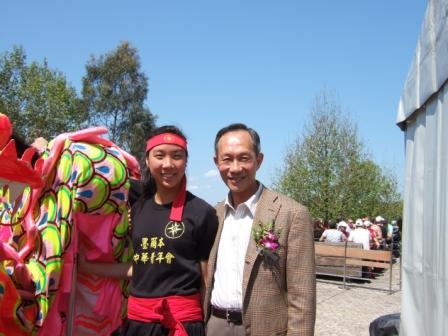 天公張著紅紅的笑臉,好讓各族人民及中華兒女們齊來參加這個充滿中華文化氣息的臺灣節日。在報到處吳天佐先生熱情的迎賓,忙著告訴工作小姐為林美豐議員及我們扣上鮮花。與林議員寒暄後、我們擠進喜氣洋洋的人群中,去參觀各社團的“陣地”。